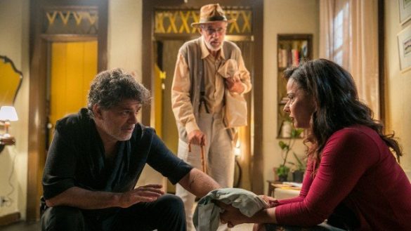 Sóstenes (Marcos Caruso) e de Murilo (Eduardo Moscovis) procuram Neide (Viviane Araújo) para falarem sobre Luz (Marina Ruy Barbosa), em “O sétimo guardião”. E assim que vê a roupinha que…