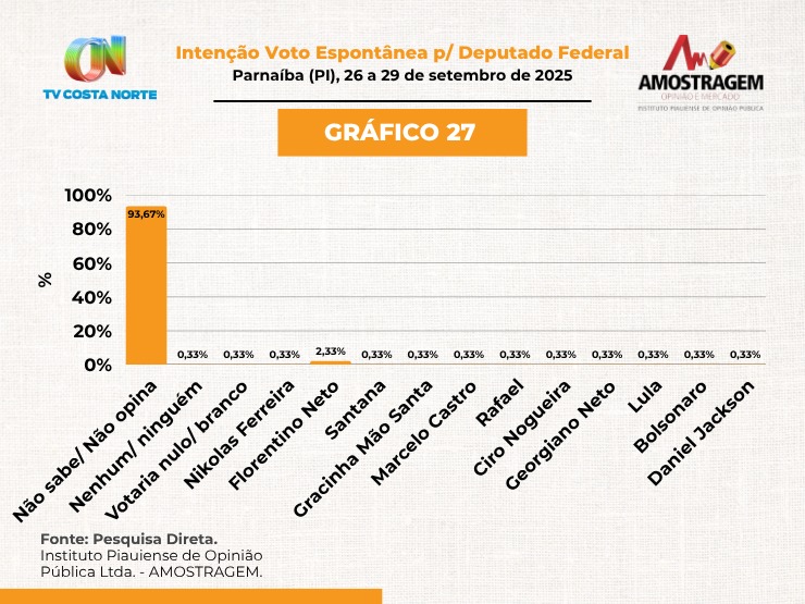 Os resultados mostram que Florentino Neto é hoje o nome mais lembrado espontaneamente entre os eleitores de Parnaíba, mas que o cenário para a disputa de deputado federal ainda é marcado por ampla indefinição, refletida no elevado percentual de eleitores que não sabem ou não opinaram.