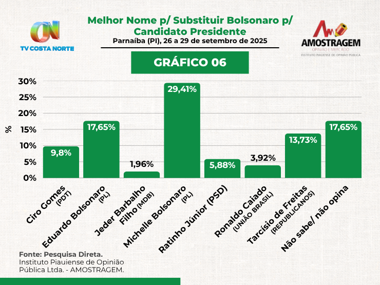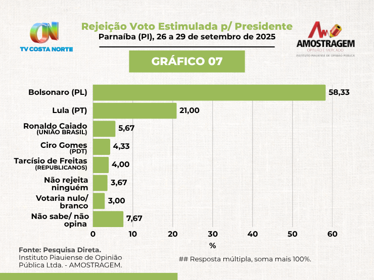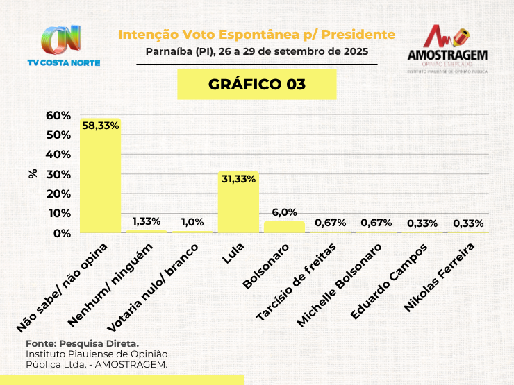 A pesquisa foi realizada entre os dias 26 e 29 de setembro de 2025, em Parnaíba (PI), com 300 eleitores a partir de 16 anos de idade, residentes na zona urbana e rural do município.