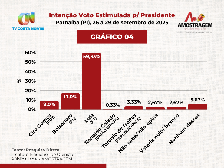 A TV Costa Norte, em parceria com o Instituto Amostragem, divulga nesta quinta-feira (02/10) os cenários de intenção de voto para presidente e a taxa de rejeição dos principais nomes, aferidos junto ao eleitorado de Parnaíba (PI). O levantamento integra a rodada de pesquisas políticas e administrativas realizadas a pouco mais de um ano das eleições estaduais e federais de 2026. Em todos os cenários, Lula mantém uma larga vantagem sobre seus adversários.