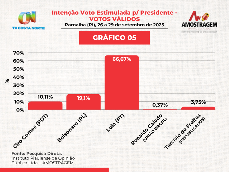 Amostragem/Costa Norte: Lula lidera com 66,67% dos votos válidos; Bolsonaro tem 58,33% de rejeição em Parnaíba