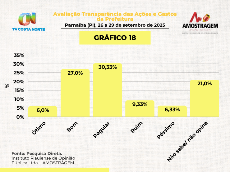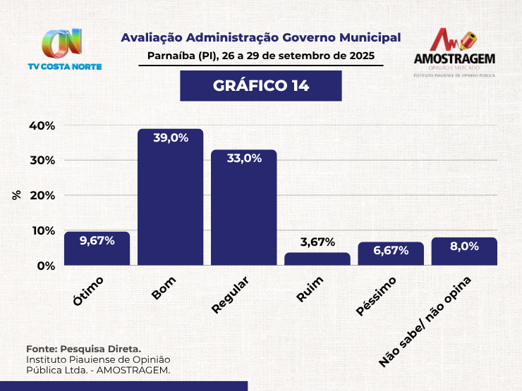 A TV Costa Norte, em parceria com o Instituto Amostragem, divulga nesta quinta-feira (02/10) os resultados da pesquisa sobre a avaliação e aprovação da gestão do prefeito Francisco Emanuel em Parnaíba (PI). O levantamento mostra índices expressivos de aprovação, mas também revela áreas sensíveis que a população considera prioritárias para os próximos passos da administração municipal.