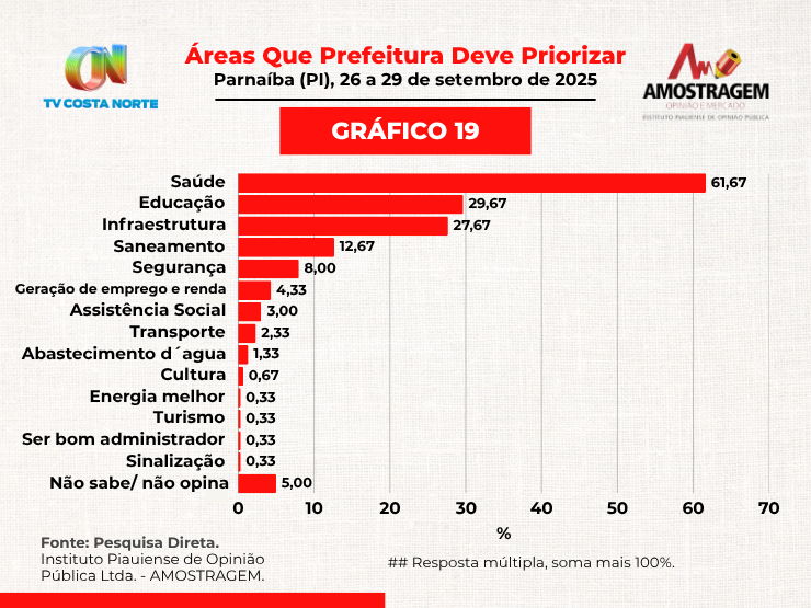 Os números confirmam que saúde e educação seguem como áreas centrais na percepção da população, bem distantes das demais prioridades elencadas.