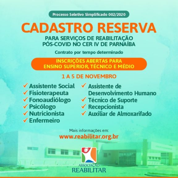 De 1 a 5 de novembro, estão abertas as inscrições para o Processo Seletivo Simplificado, realizado pela Associação Reabilitar. Os cargos são para Nível Superior, Técnico e Médio para o preenchimento de cadastro reserva da Unidade Pós-Covid 19, que irá funcionar no novo Centro Especializado em Reabilitação (CER IV) de Parnaíba.