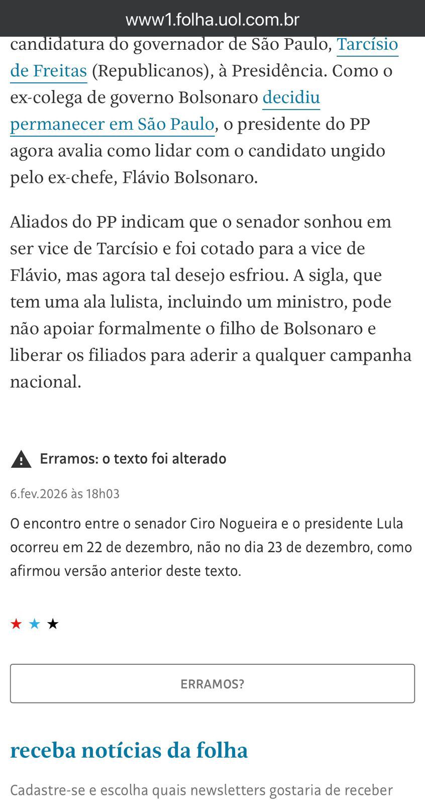 Ciro Nogueira contesta matéria e mostra agenda do dia 23/12; Folha de SP admite erro