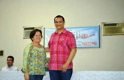 Secretária Geral da UME, Eliete Freitas condecora Fábio com um broche que tem o formato do mapa do Piauí, feito com pedra de opala