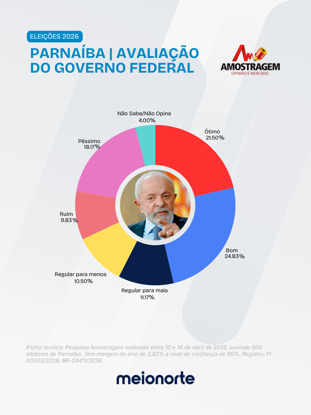 O governo Lula tem aprovação de 57,83% dos eleitores de Parnaíba, segundo a pesquisa Amostragem. A rejeição ao governo federal chega a 37,83%, e 4,33% dos entrevistados não souberam ou não opinaram.