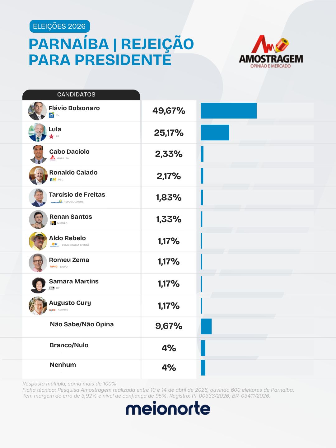 O índice de “não sabe/não opina” é 41,33%, o que indica que a disputa presidencial ainda não mobilizou uma fatia expressiva do eleitorado de Parnaíba.