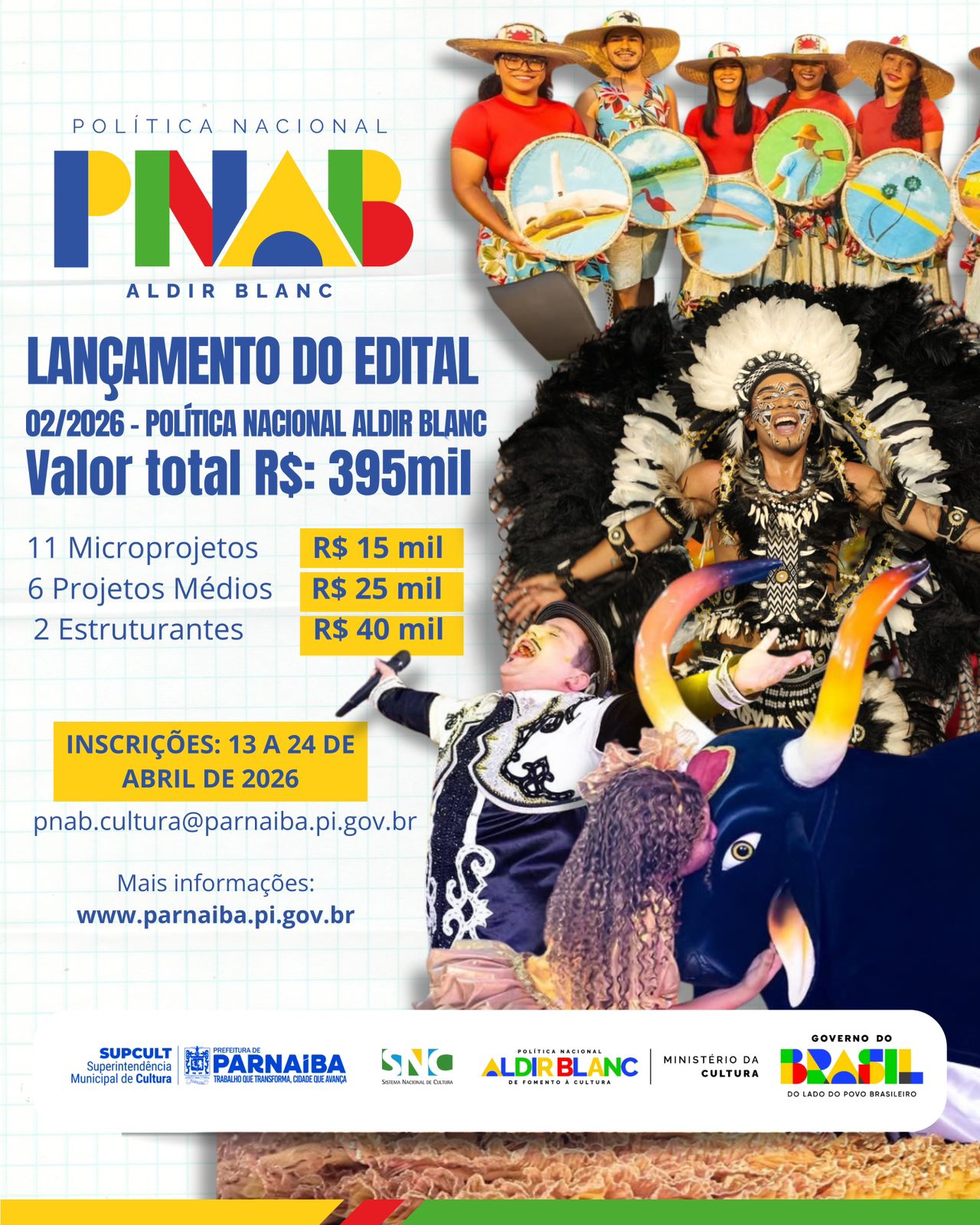 A Prefeitura de Parnaíba, por meio da Superintendência Municipal de Cultura, anunciou a abertura das inscrições para o primeiro edital do ano focado na Política Nacional Aldir Blanc (PNAB). A iniciativa visa descentralizar o investimento em cultura e garantir o apoio a artistas locais durante todo o calendário anual.