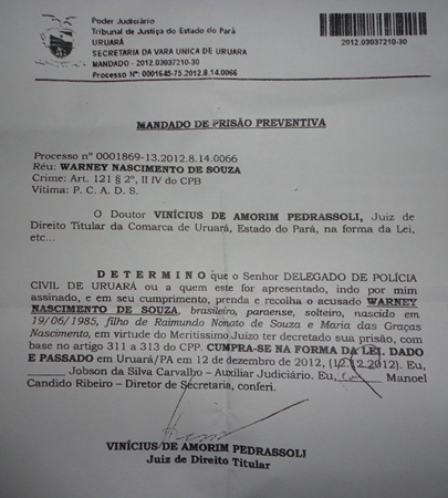 A Polícia Civil do Pará, em conjunto com a Polícia Civil do Piauí cumpriu, nesta terça-feira (09) o mandado de prisão de Warney do Nascimento de Souza, de 27 anos, na cidade de Parnaíba (PI), decretado pela Comarca de Uruará, sudoeste do Pará.