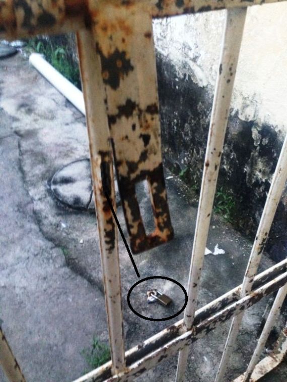 Já no portão de acesso ao pátio, último obstáculo para a fuga, uma base da barra de ferro foi rompida e o cadeado sacado fora, como mostra a imagem.